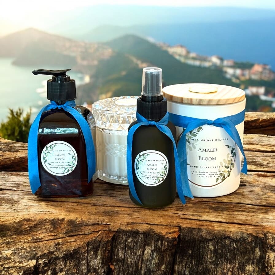 Begin with the Amalfi Bloom reed diffuser to establish a consistent background fragrance.